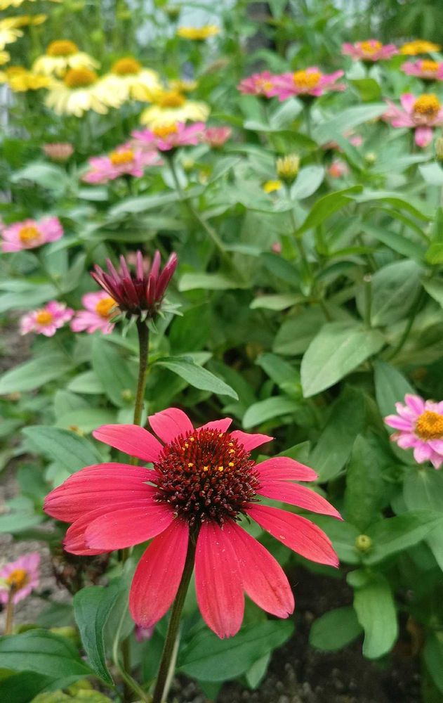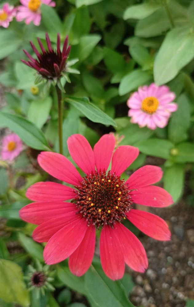 赤いエキナセア♥️と種蒔きっ子ジニア🩷たち…