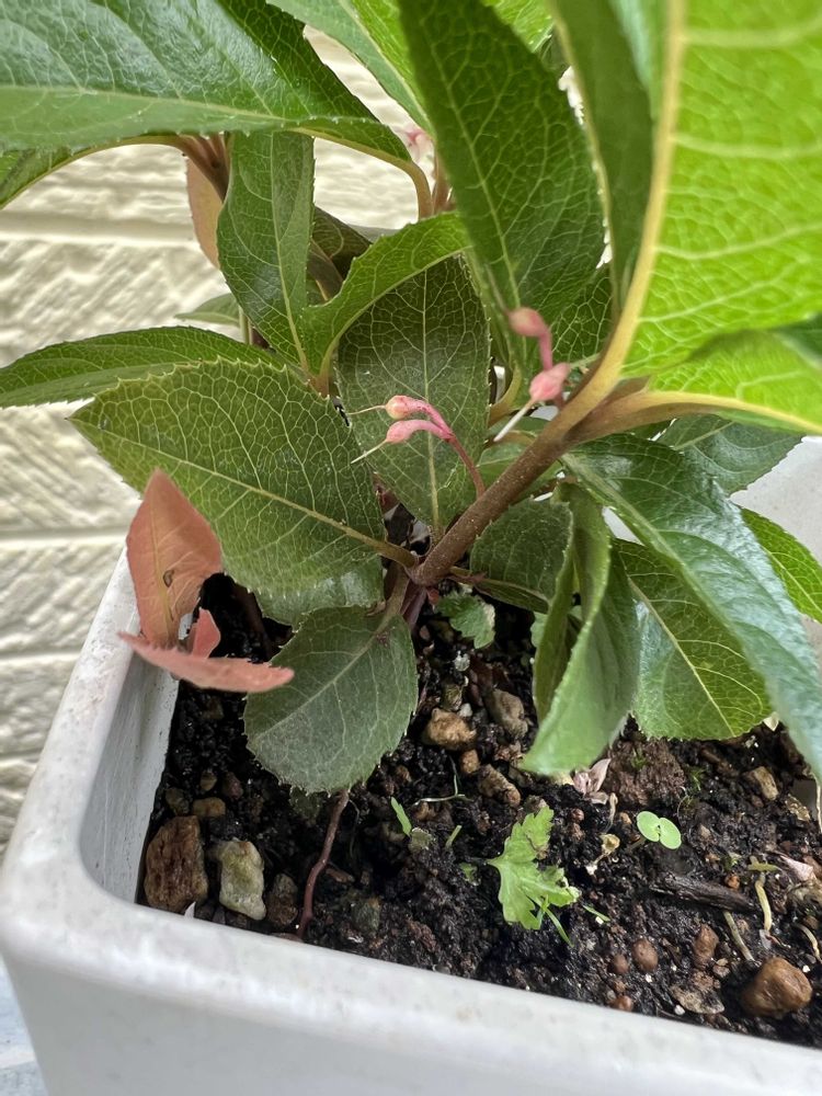 今日雨が止んだ隙に古い方のヤブコウジ見てみたら、今にも枯れそうだったのに花芽がついてました🎶