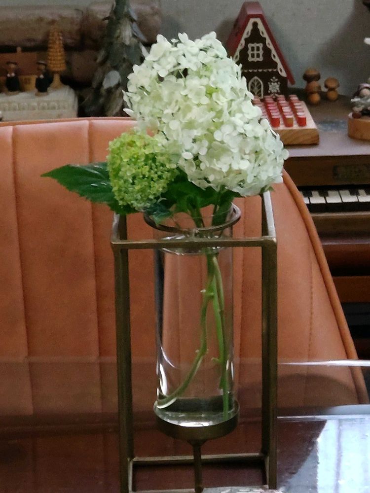 テーブルの上の花瓶に挿したアナベルは、まだまだ元気で、その美しさを保っています。💕🥳🎉