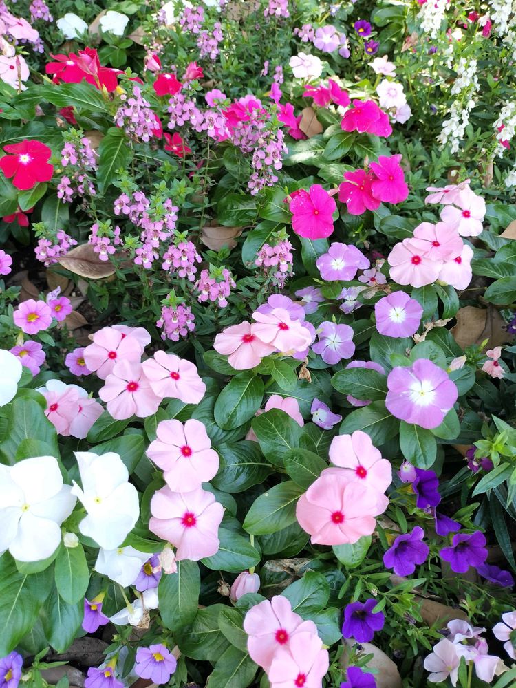 ニチニチソウ、アンゲロニア、スーパーチュニアなどが彩り良く植えられています🤗💞
