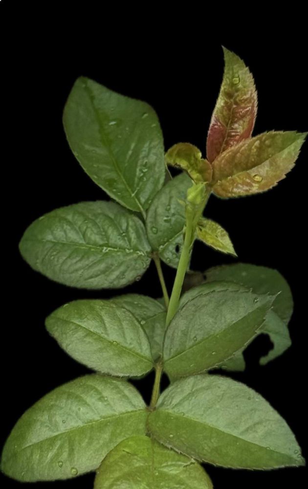 📝ベランダで植栽養生中のブルー・バユーの薔薇が、新芽の若葉と共に、このように約5mmの小さな花つぼみを付けています。