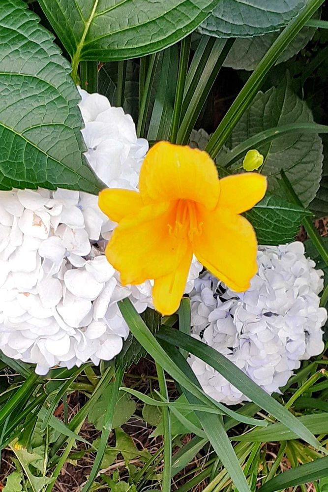 紫陽花の真ん中に黄色のマンシュウキスゲさん可愛い💛