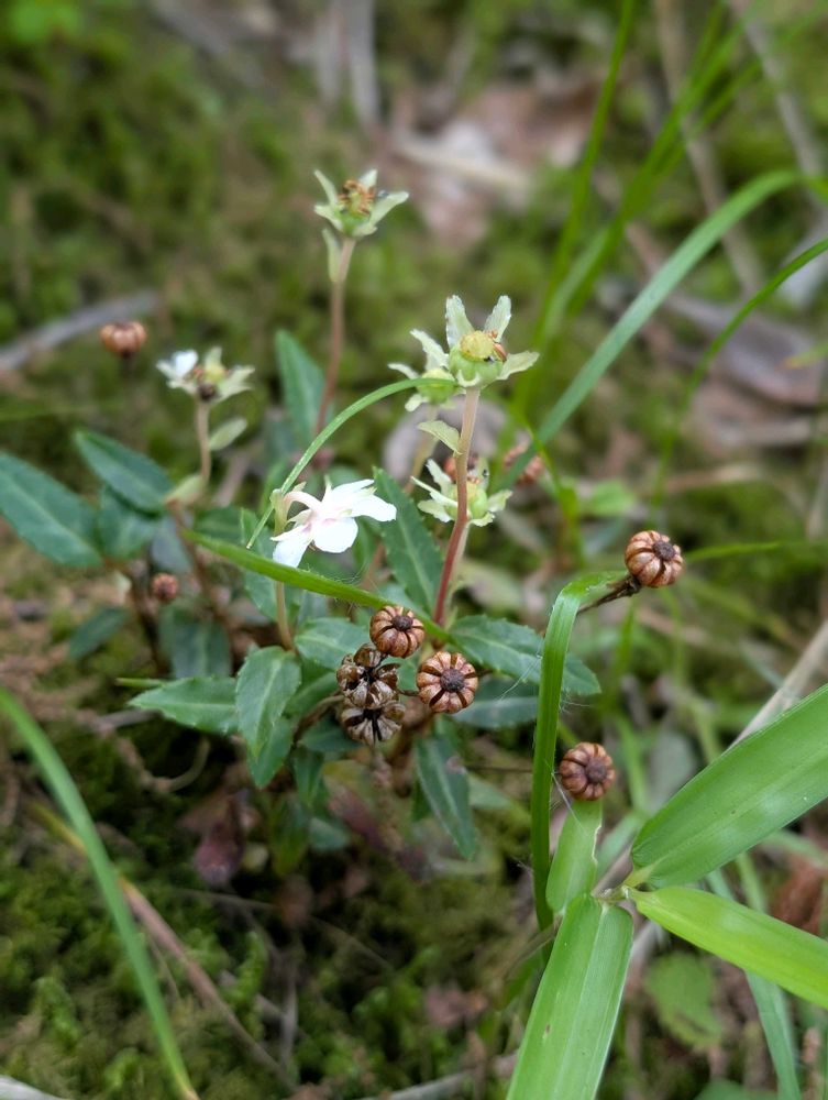 茎頂に長い花柄を出し、下向きに花を1個つける。花冠は白色、直径約1cm、5避けする。