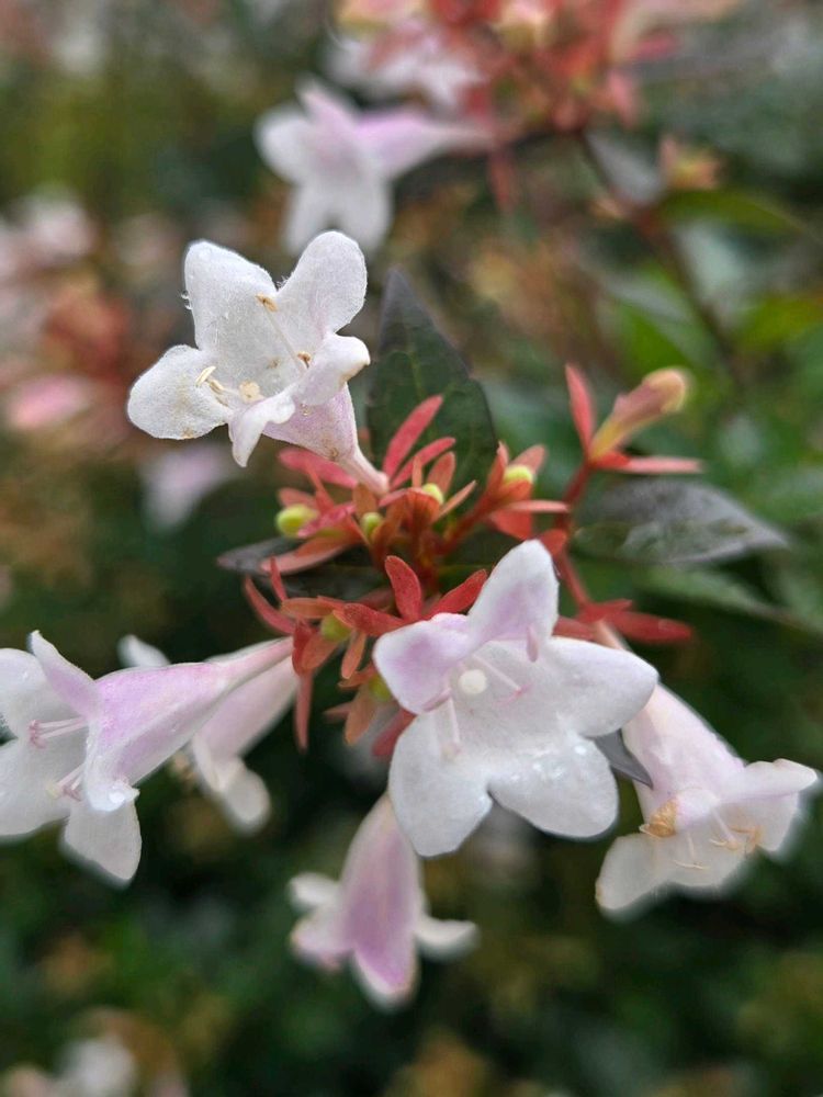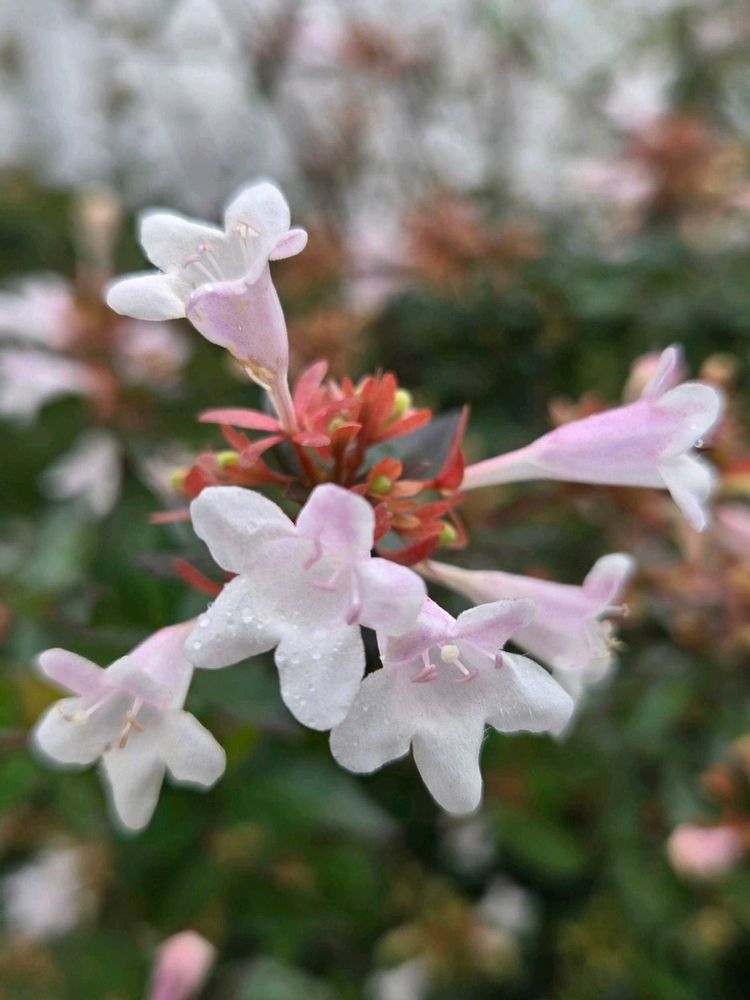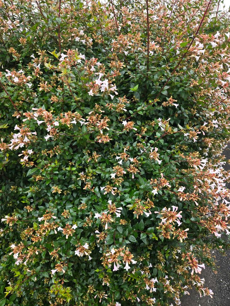 スイカズラ科アベリア属の低木で、和名はハナゾノツクバネウツギ(花園衝羽根空木)やハナツクバネウツギとも呼ばれます。花が終わった後に残る萼片が羽根つきの羽根に似ていることからこの和名がついています。