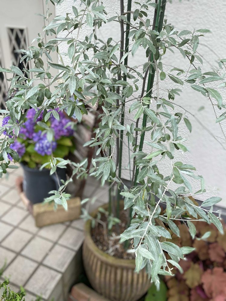 細い枝が色々な方向に勢いよく伸びてしまったので真っ直ぐ立っているのが無いんですよ〜😅今や枝垂れロシアンオリーブみたいになってきています😂
