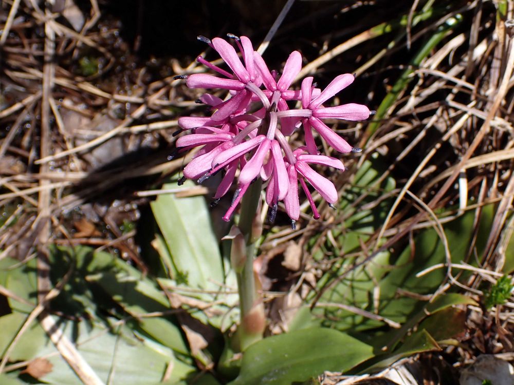 細長い、根生葉が、ロゼット状になっていて、その真ん中から、10cmくらいの花茎を出して、花を横向きにつけていました。(①)