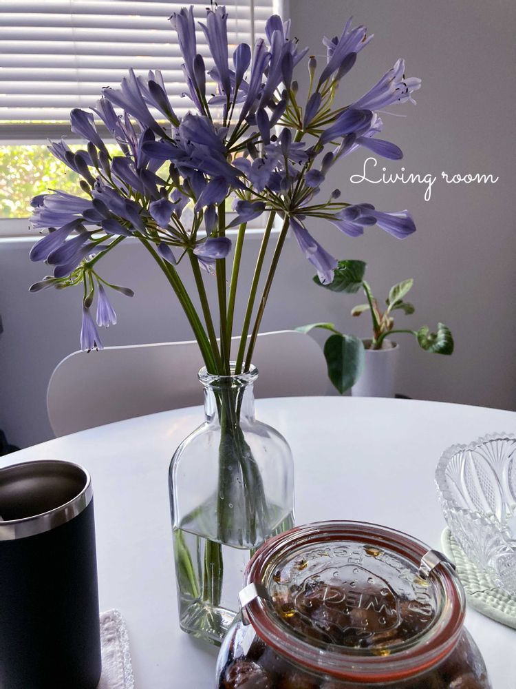 アガパンサスが咲き始めましたが、強風で洗濯物🧺が落ち数本折れてしまいましたので水差しに挿しました。