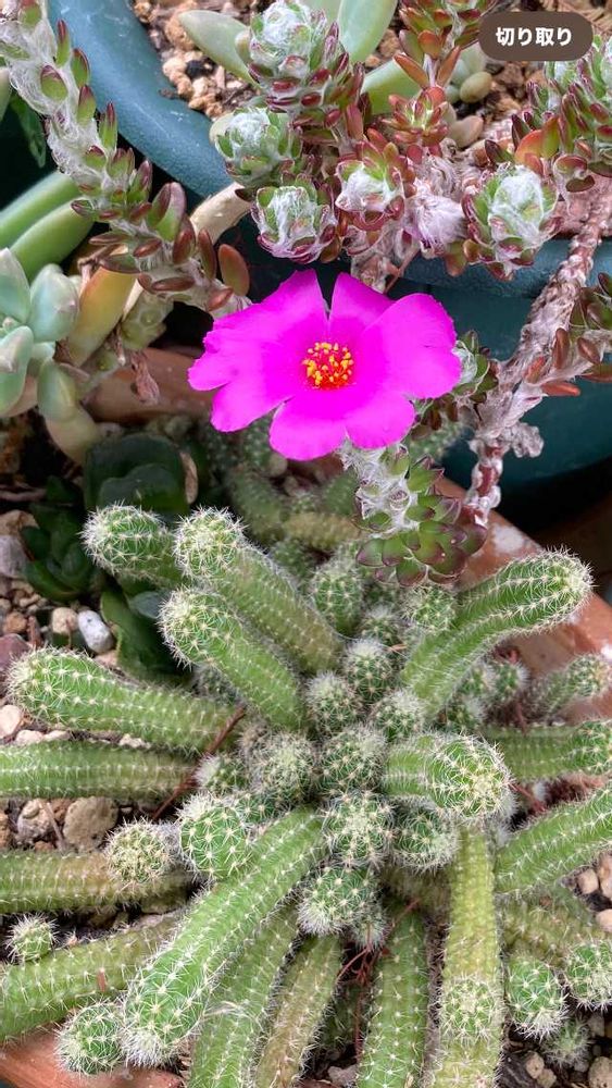 上の綿帽子被った多肉にピンクの花が咲きました。ピンクの花🌸
