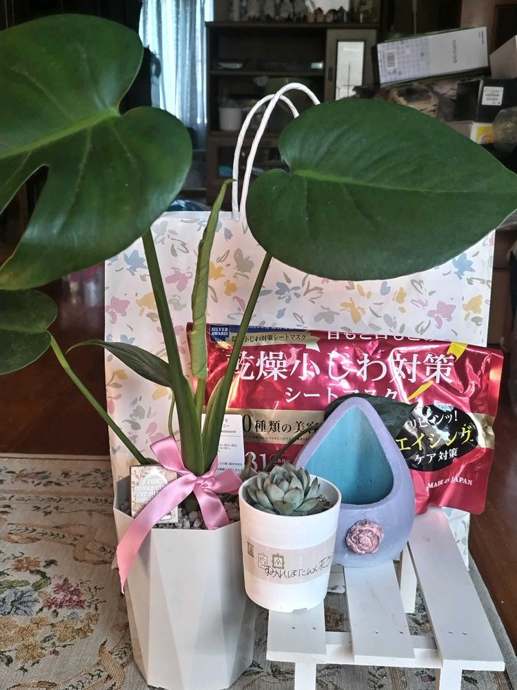 大きいモンステラちゃん、かおりんさんのリメ鉢、葉挿しから育てた多肉ちゃん、フェイスマスク、アイシャドー…たくさん嬉しいです(⁎ᴗ͈ˬᴗ͈⁎)