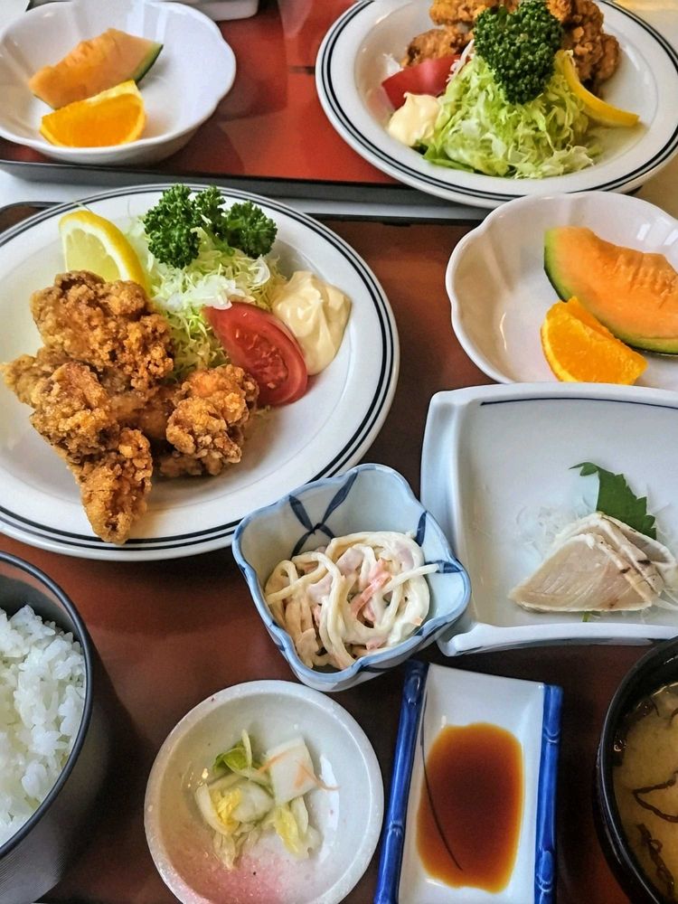 唐揚げ4個、キャベツの千切り、トマト、お刺身、スパサラ、ご飯、味噌汁、つけもの、メロン&オレンジ