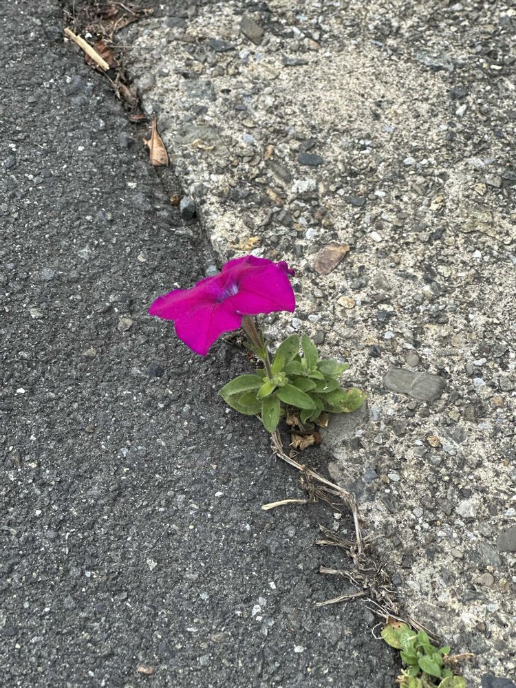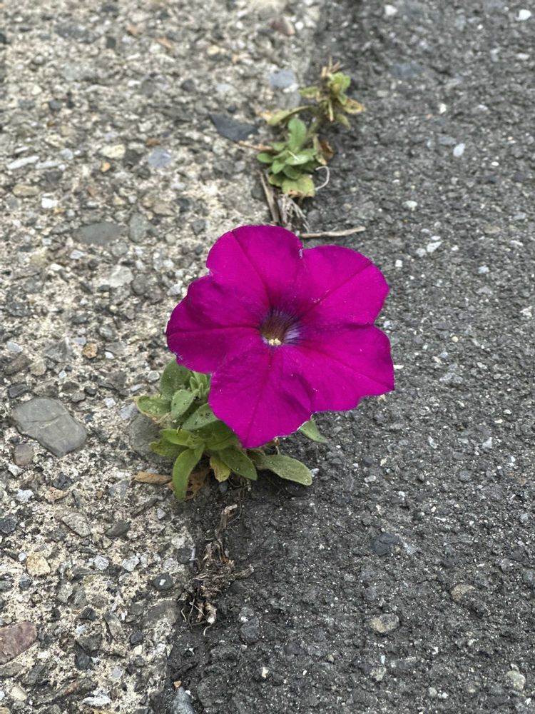 道路の端っこに、一輪のペチュニアと、落ちたように見えてしっかり根を張ってるパセリ。:✧*。