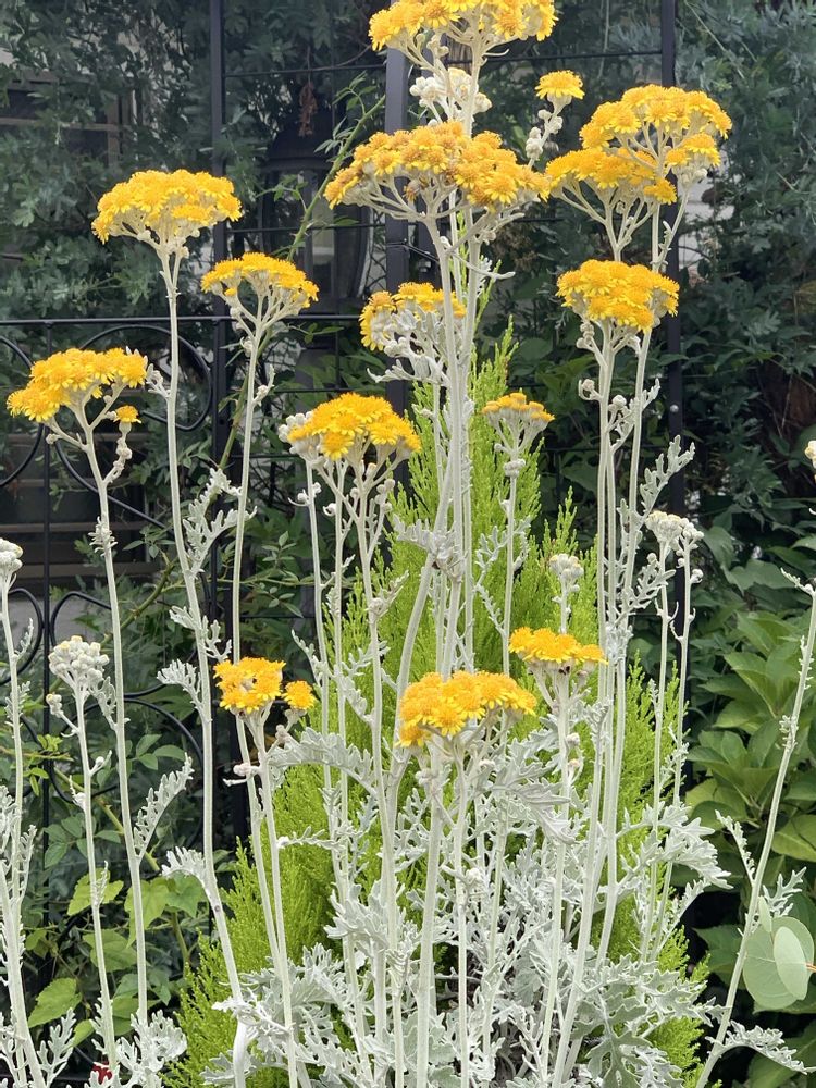 シロタエギクさんの花が咲きました😊放ったらかしにしていたら私の背より高くなり、そびえ立っています🤭ゴールドクレストさんより高いです