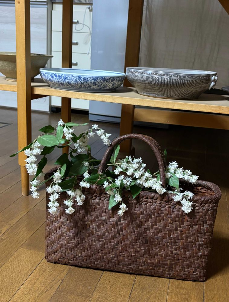 ブドウ蔓の籠は20年くらい前に買ったものです。夏のお出かけに使っていますと、声をかけられます。
