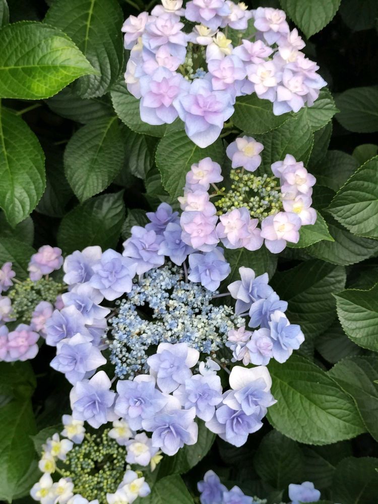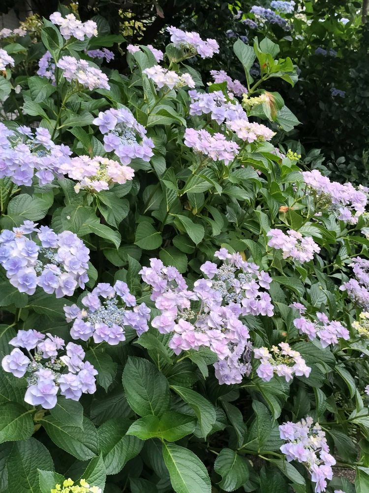 お散歩コースのガクアジサイ、去年よりピンク色が混ざっていてビックリ😯!!