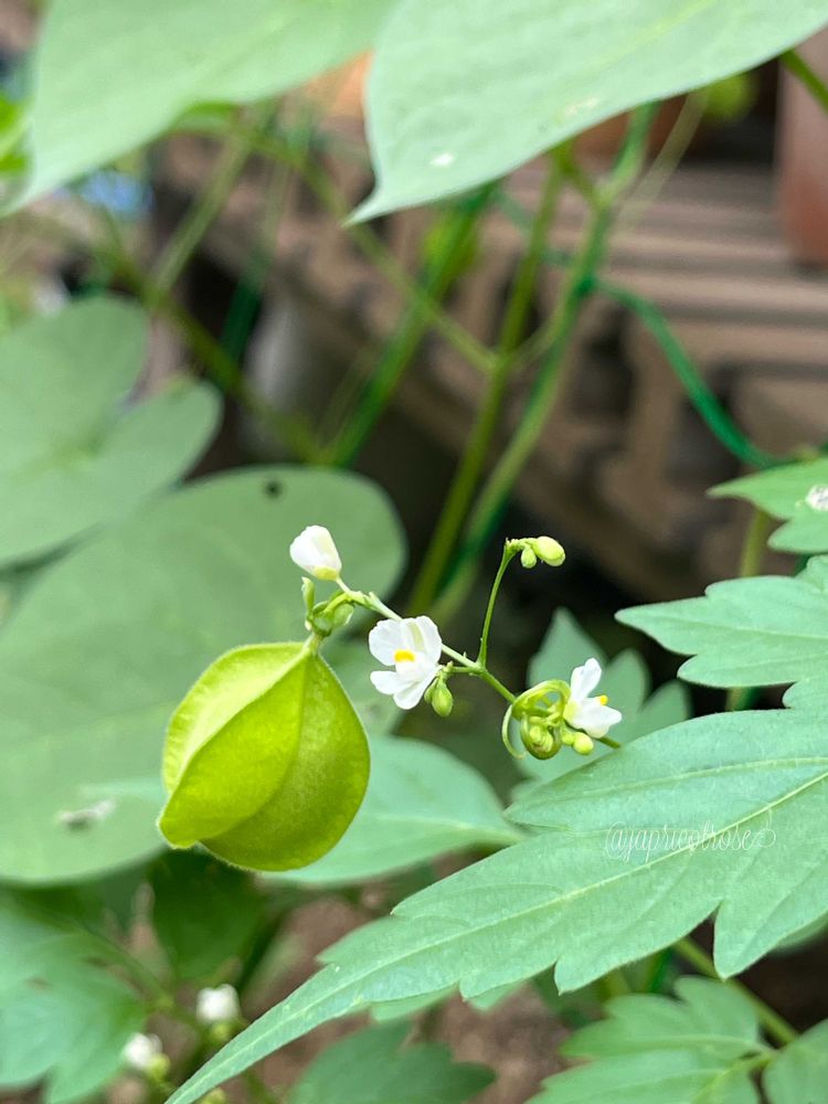 ①グリーンカーテンのフウセンカズラの実が膨らんできました✨白い小さな花も涼しげです🥰