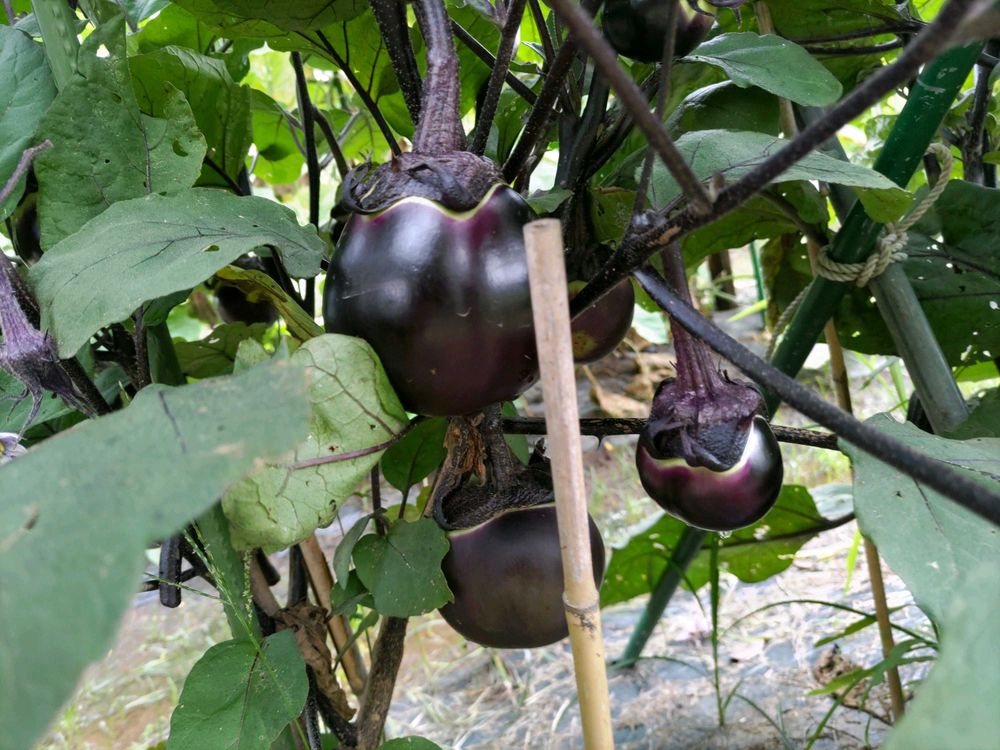 ころんとした可愛いナスです。お料理は、米茄子と同じようにしたり、普通のなす🍆と同じ料理します。肉厚ですが、柔らかいのでいろいろ用途が有ると思います😊。百日草も今年は背丈も長く、蕾も次々と咲いてくれてます🩷🤍💛🩷🌿