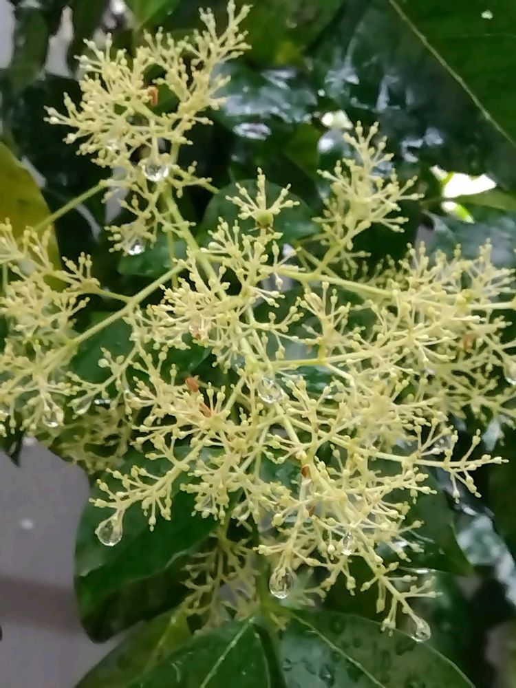 シマトネリコのお花が豪雨の後雫をまとって