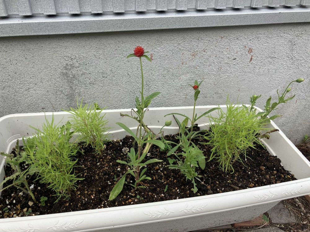 千日紅とコニファーとポピーをプランターに寄せ植えしました〜