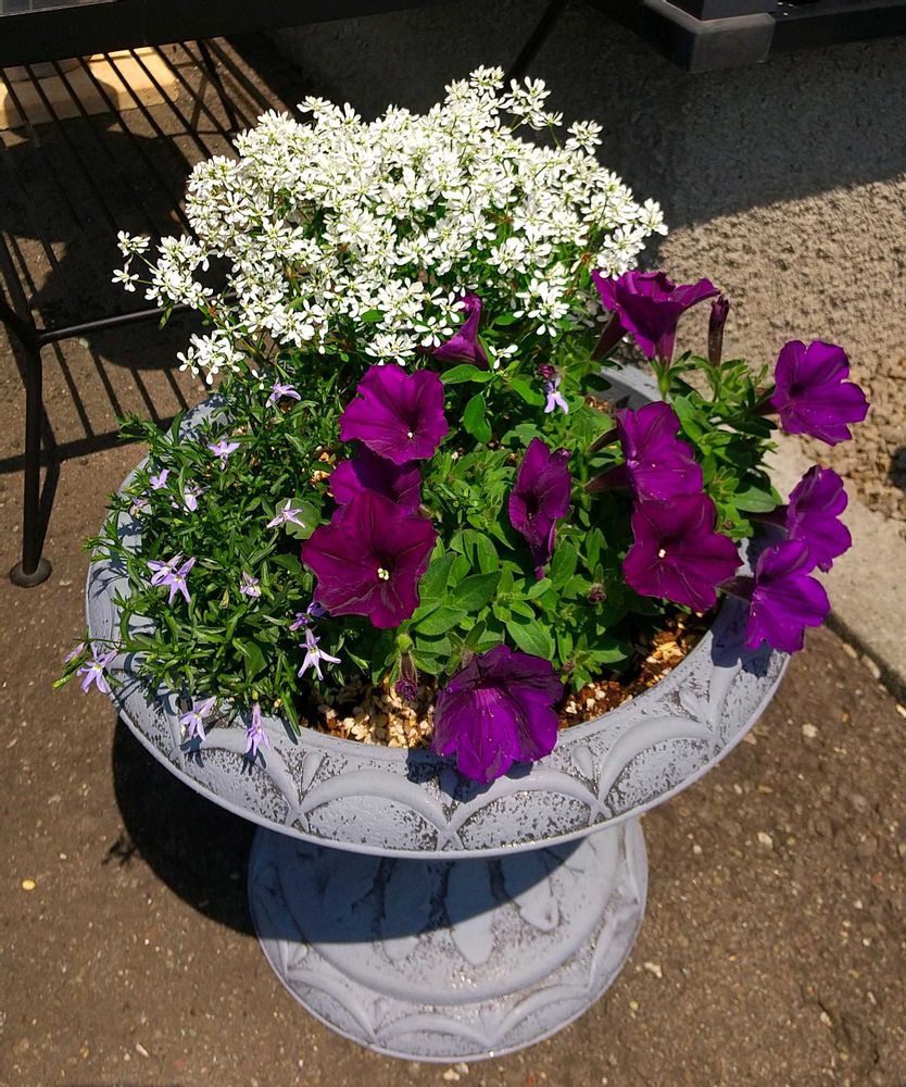 夏の寄せ植えの鉢、ペイントしました。青いペチュニアはスーパーチュニアのベルベットだったかな。花弁がお洒落です。ユーフォルビアダイヤモンドスノーとロベリア、全てPWのものです。