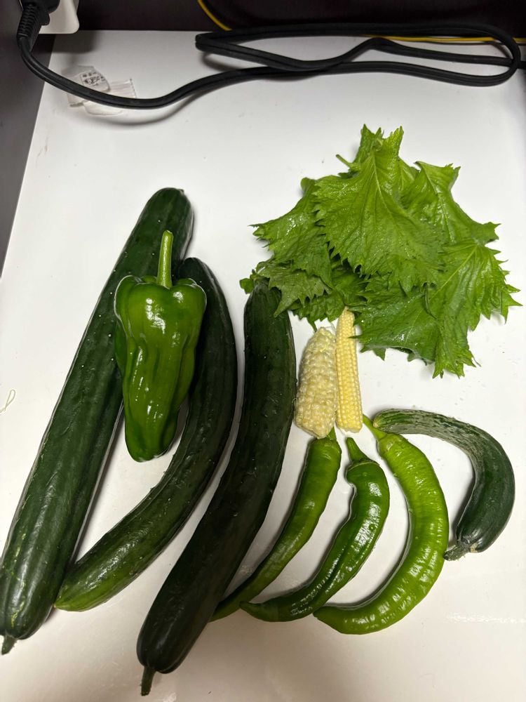 夕方の収穫。ダイソーで2個¥110で買った地這い胡瓜の種3粒蒔いたら凄い勢いで成長してます。びっくりです。伏見甘長と福耳ジローの区別がわからない。間引きのヤングコーン🌽青紫蘇。本当にありがたい😊