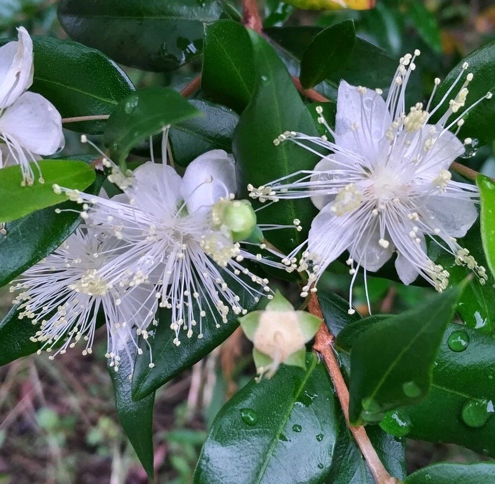 ポツポツ雨が降る中、大きな木の下で咲いている白い花。