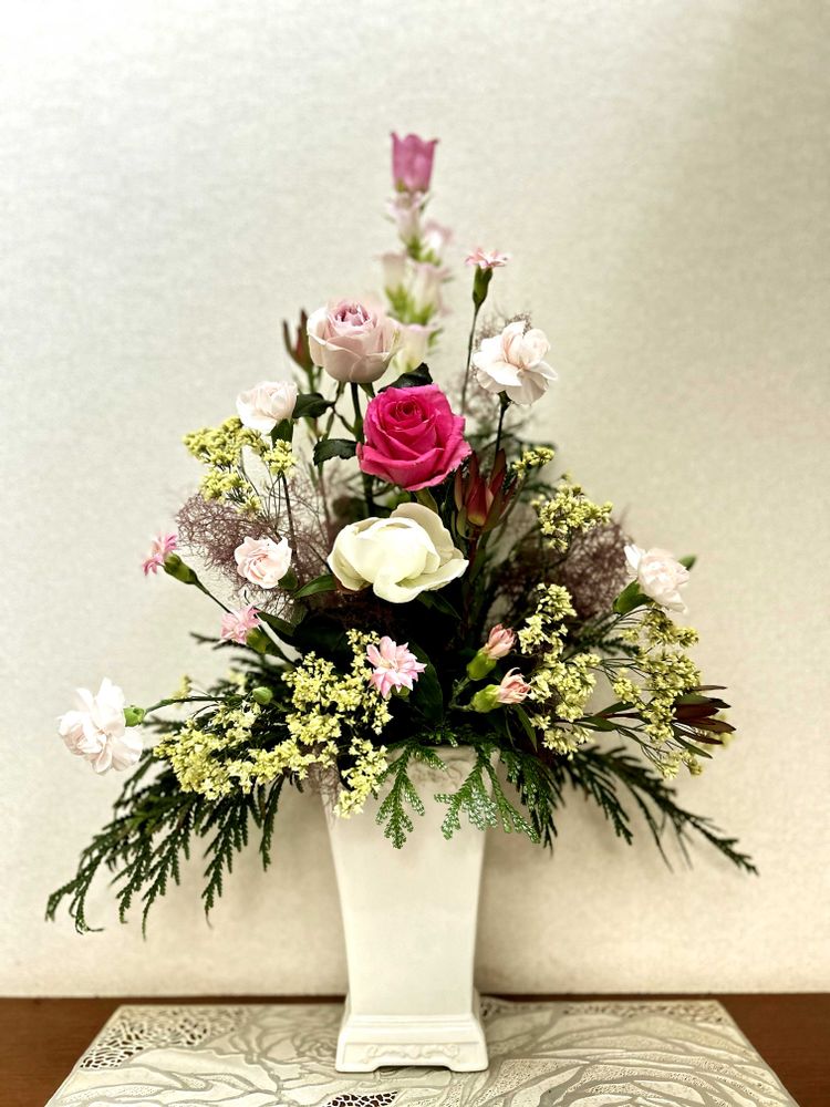 ②涼しいリビングでフラワーアレンジメントのシャクヤクもジワジワ開いてきました🔼