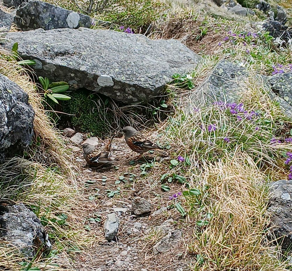 遠くから見ると,岩に紫色のかたまりがへばりついているように見える。
