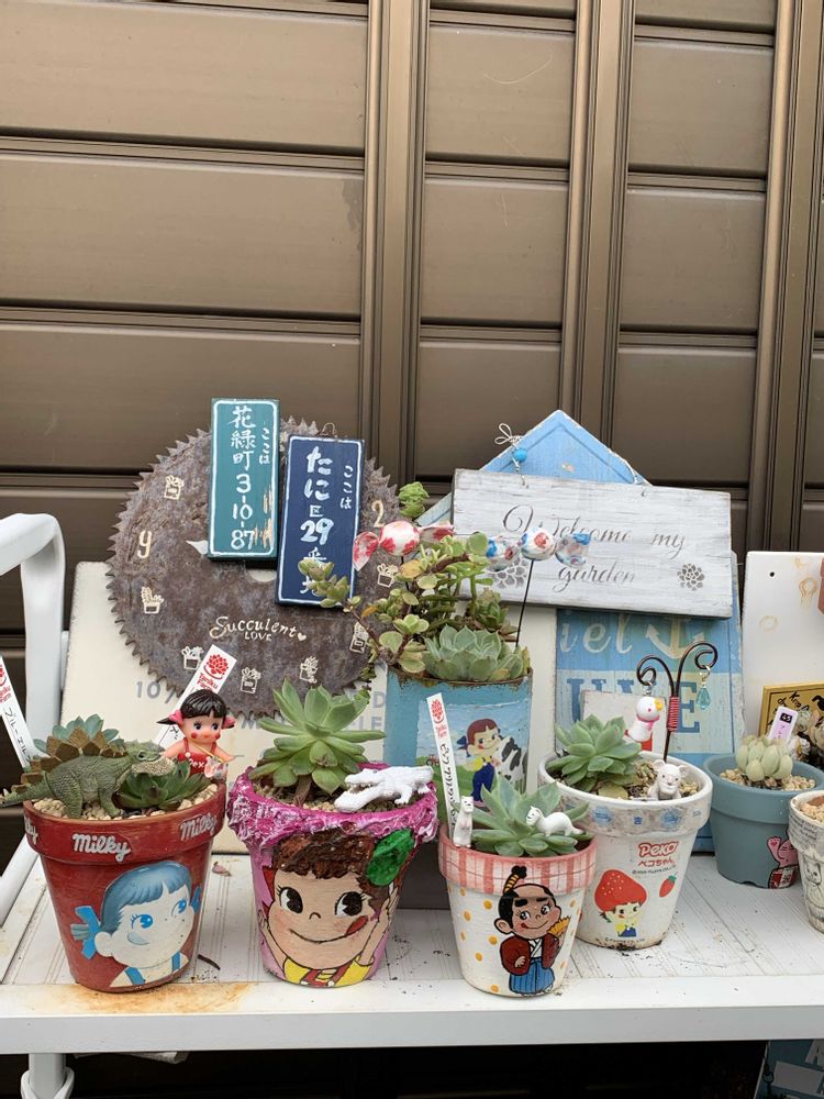 付けてみたりんちゃんのペコ殿リメ鉢、トワちゃんのペコちゃんリメ鉢、自作ペコちゃんリメ鉢にそれぞれ乗っけて賑やかにしてみました。