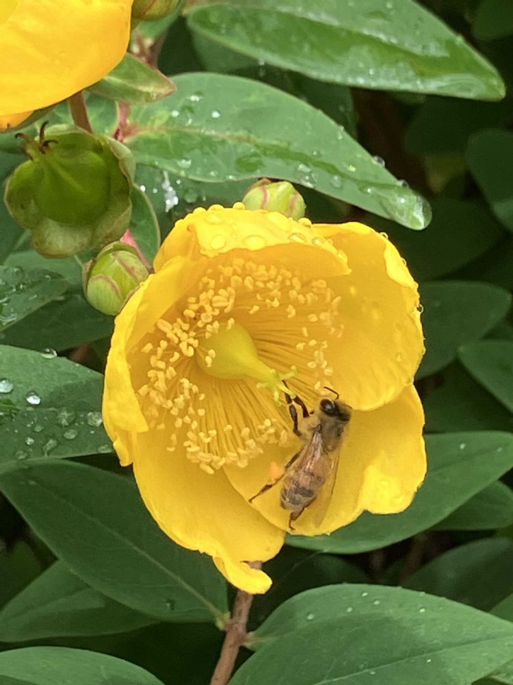 雨粒💧に、ミツバチ🐝、キンシバイにも梅雨の風情を感じます🌿