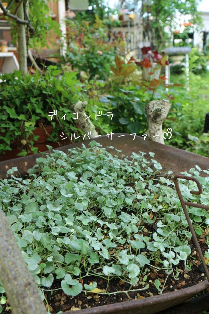 一輪車には、ディコンドラ5ポットを植えました❣