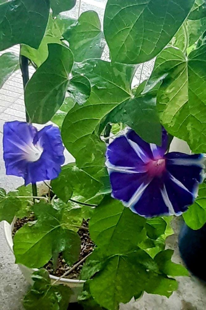 此方も少し前に 良く似た色合い💙💜の朝顔が咲きましたよう🤗違う花色の蕾も沢山付いているので 毎朝が楽し٩( ᐛ )و🎶💕