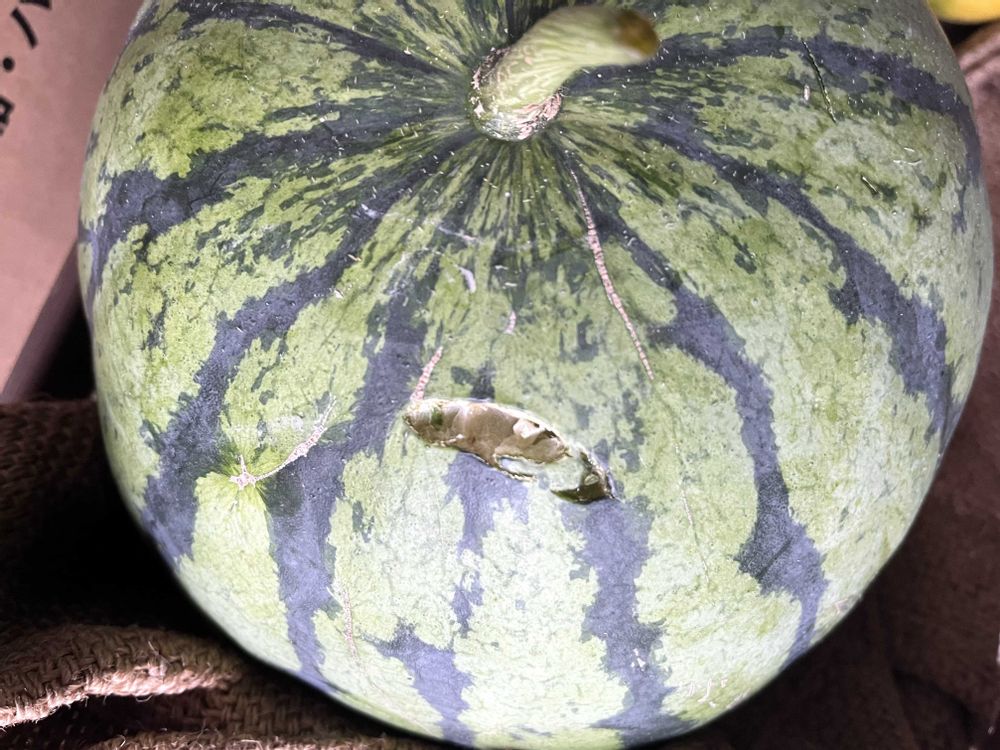 ⑤. 叩いてみて、澄んだ「ポンポン」という音がしたら食べ頃、乾いたような「パンパン」という高い音の場合は未完熟、というふうに見分けることができます。ポコポコは熟れ過ぎで巣があるかも、、、。