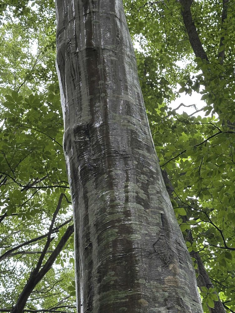 けれど水を溜めやすい形状になっているブナの葉は、すべすべして流れやすい木の幹にいくつもの筋を作って大量の雨水を下へ流れ落とします。