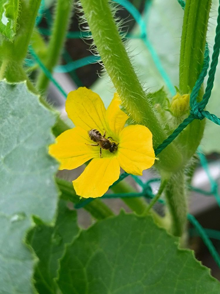 まだまだ梅雨の中雨のやみ間に蜜蜂さんが受粉のお手伝いに来てくれてる!(^_^;)💦