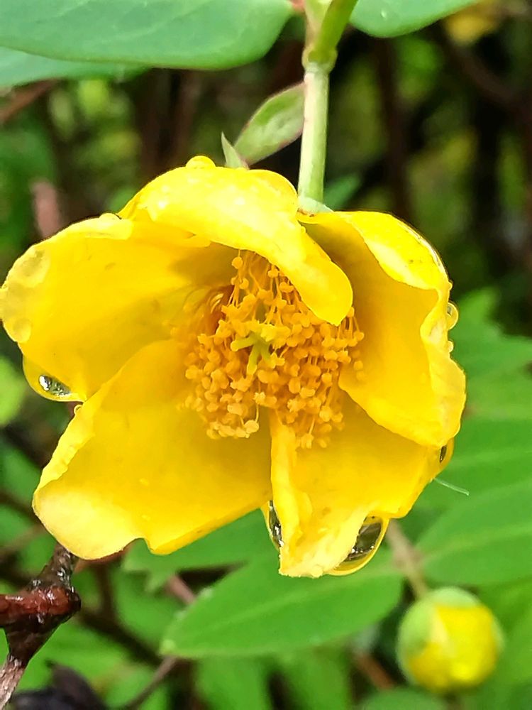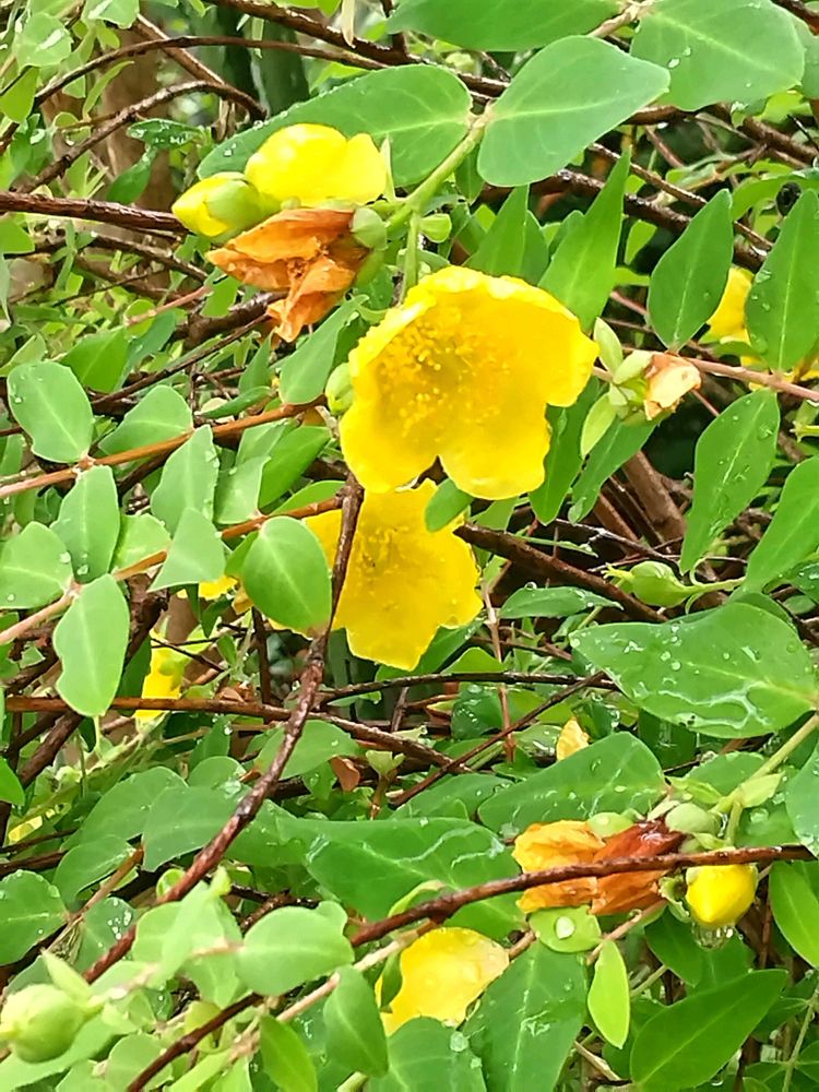 🌼近所の庭から道路に向かって、キンシバイが降りだした雨に濡れていました。