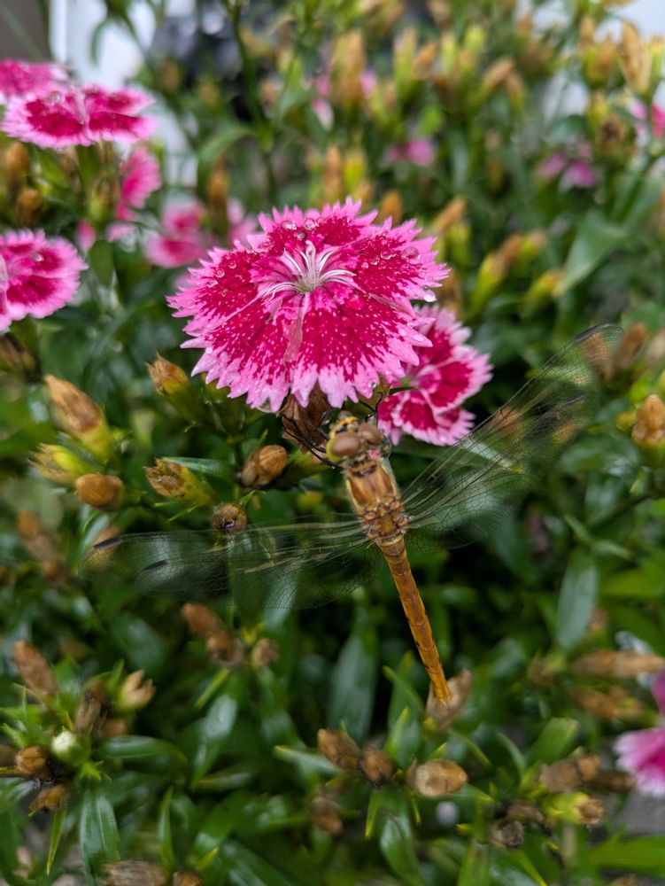ナデシコチョキンし忘れていたらまた花が咲いてしかもトンボまでいて気づくと言う(泣)
