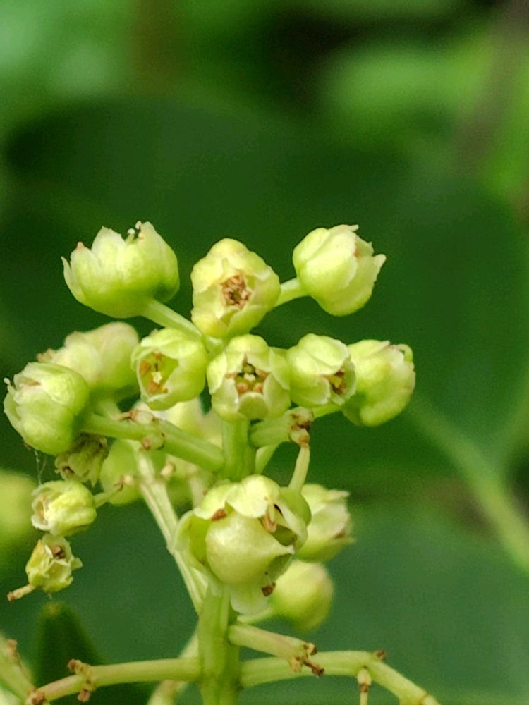直径5mmほどの淡い黄緑色で、花弁と萼が5枚ずつあるがあまり目立たない。