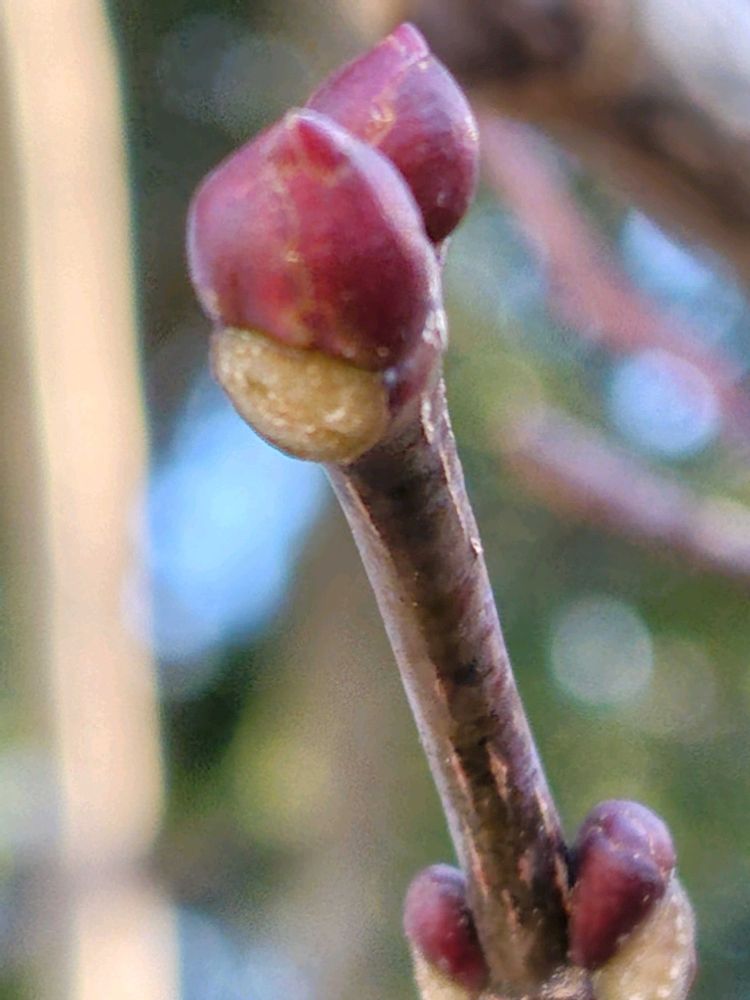 ④冬芽は、枝先に仮頂芽が2個付く。芽鱗は2〜4個で赤色で無毛。葉痕は半円形〜円形で維管束は9個。