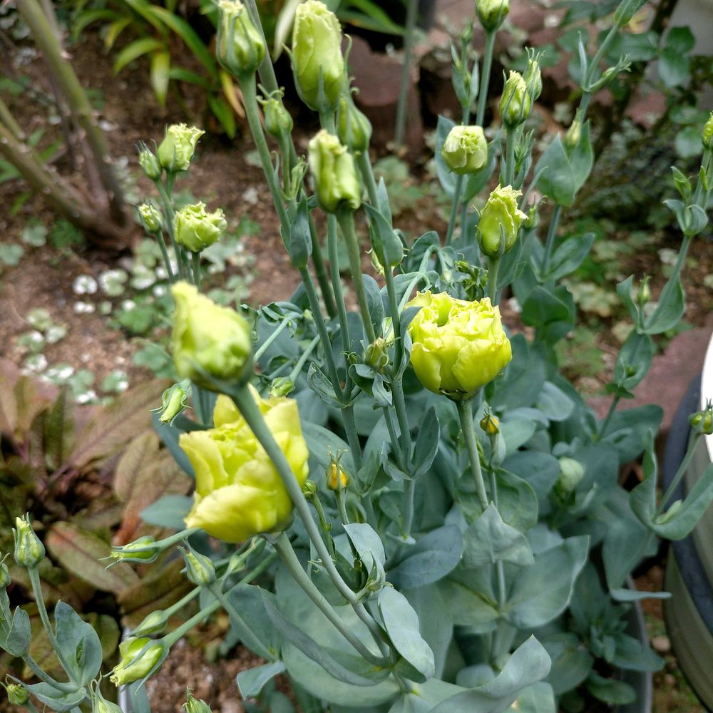 【2枚目】トルコキキョウは現在こんな感じ。蕾はまだ全部ライム色で、ここから色づいてきます。何色が咲いてくれるかなー😚