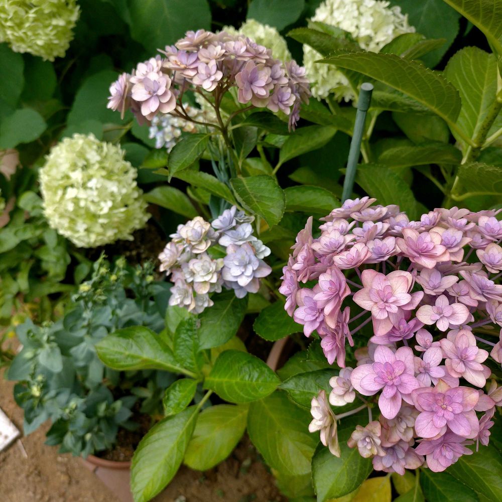 【3枚目】アジサイも素敵色に😍 奥のアナベルもライム色に変化してきました。