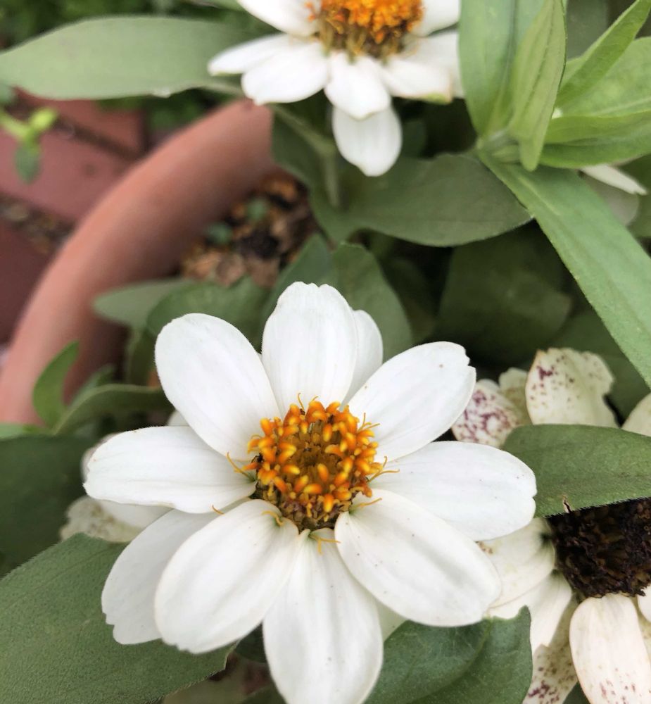 ひと月前に鉢植えした『 ジニア 』さん、株大きくなり花の蕾もたくさん付けて咲いてきました。花弁の色が変化しながら咲いていくので良いですね。