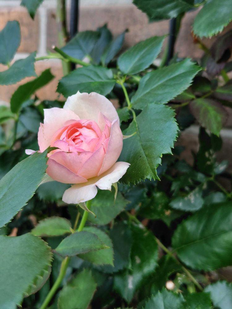 少し通行量の多い道路沿いの煉瓦仕立ての壁のお家…東側と南側の建物に沿って咲いていて、植木鉢の物もありました。