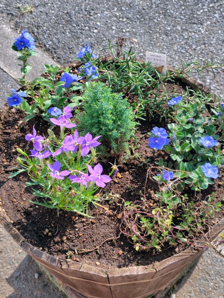 ④…大きな樽型に近いコンテナに配色美しく咲いていました✨🤗💜🩷🩵💙🩵