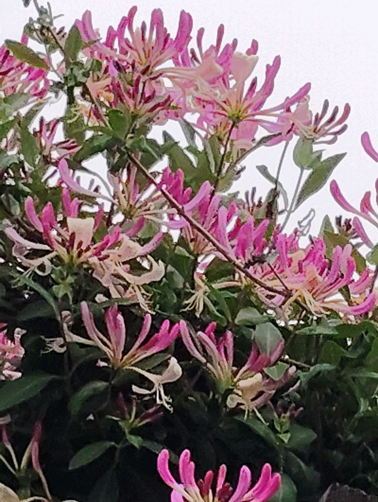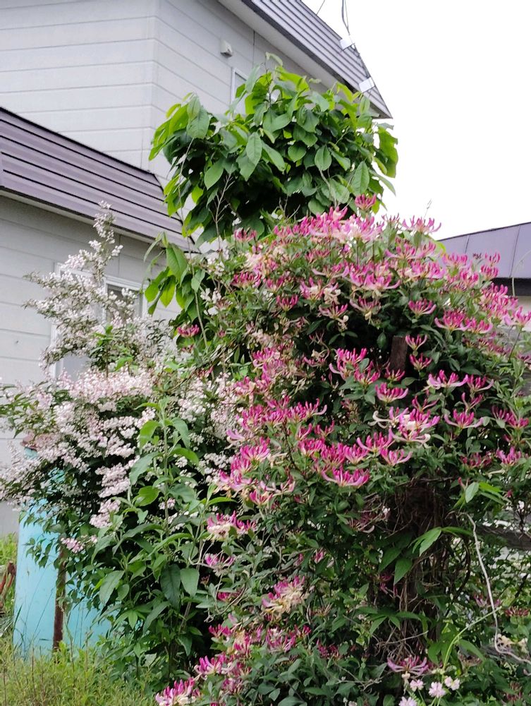スイカズラも後ろの花も急に咲いてます。台所の戸を開けた途端真っ赤な塊、その後ピンクが目に入り、今年の花の凄さに圧倒されました。