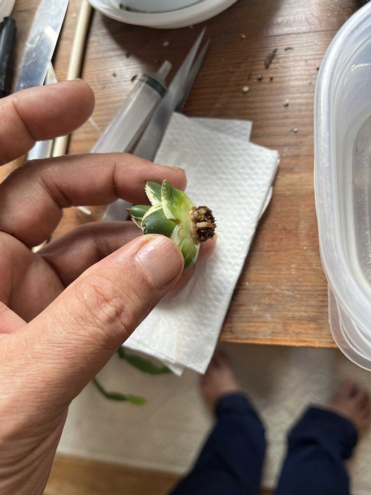 オキシベロン液(1/500)に12時間浸し、希釈して1/1000 に12時間漬けてみたのですが発根してますね。