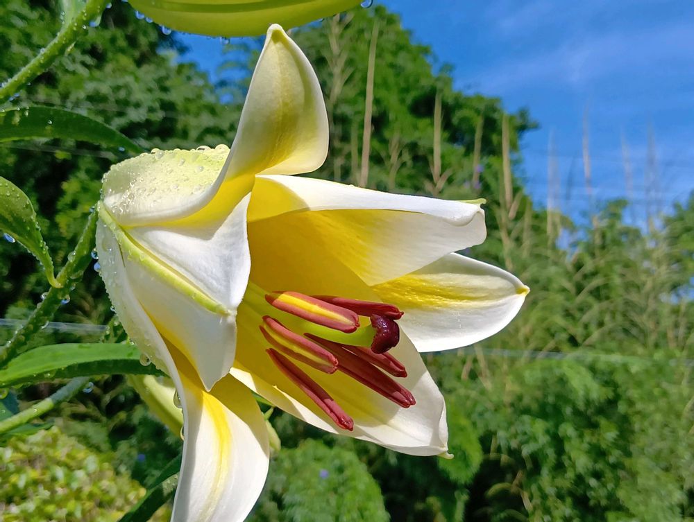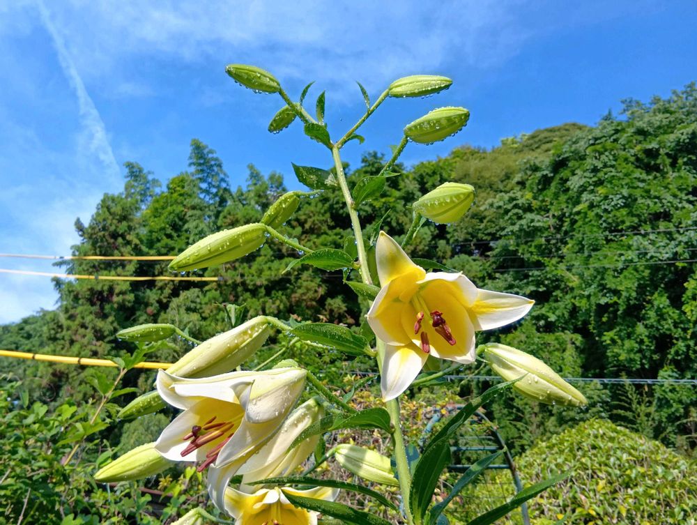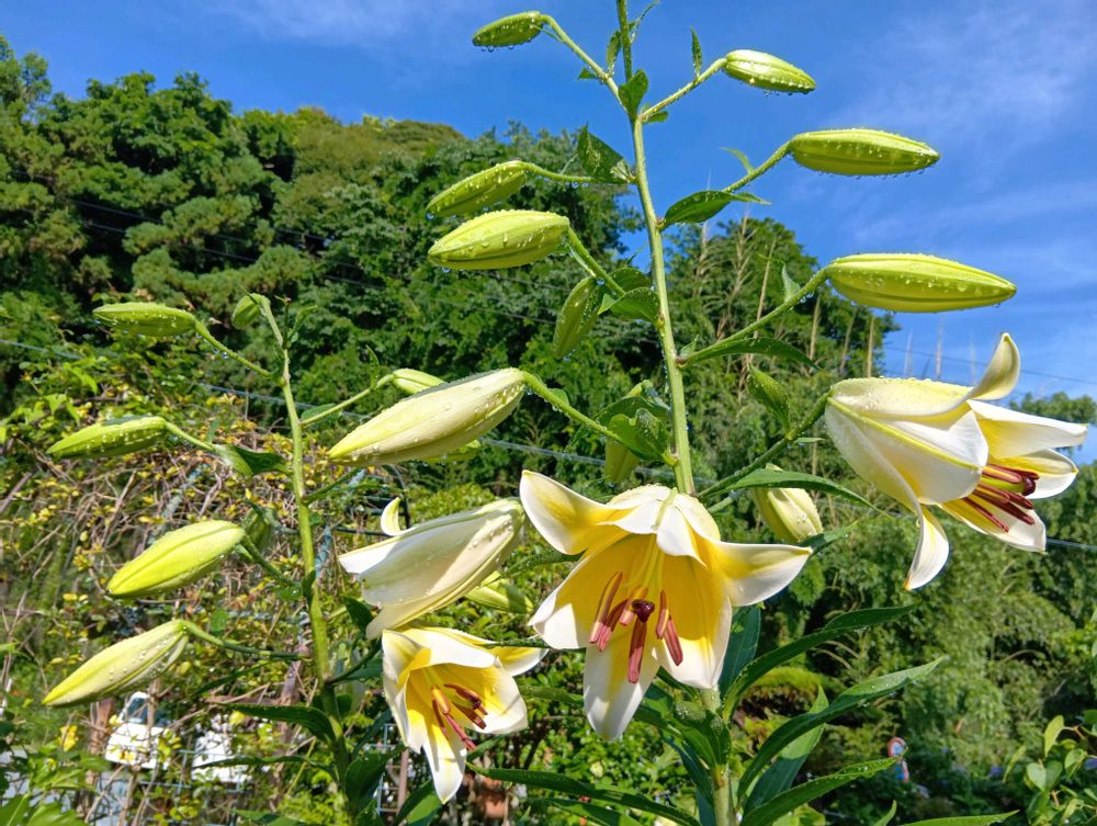 雨上がり、綺麗な青空に映える背高のユリが咲き出しました。