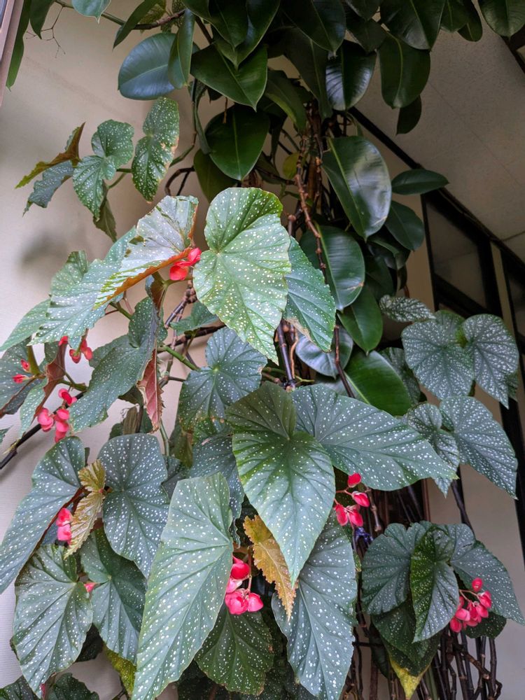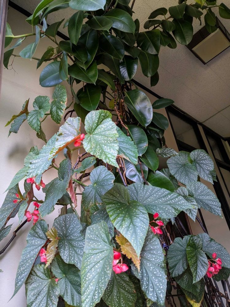 52年目老木ゴムの木の鉢植えに折れたベゴニアを挿したら…競い合いこんなに成長したのよ💫