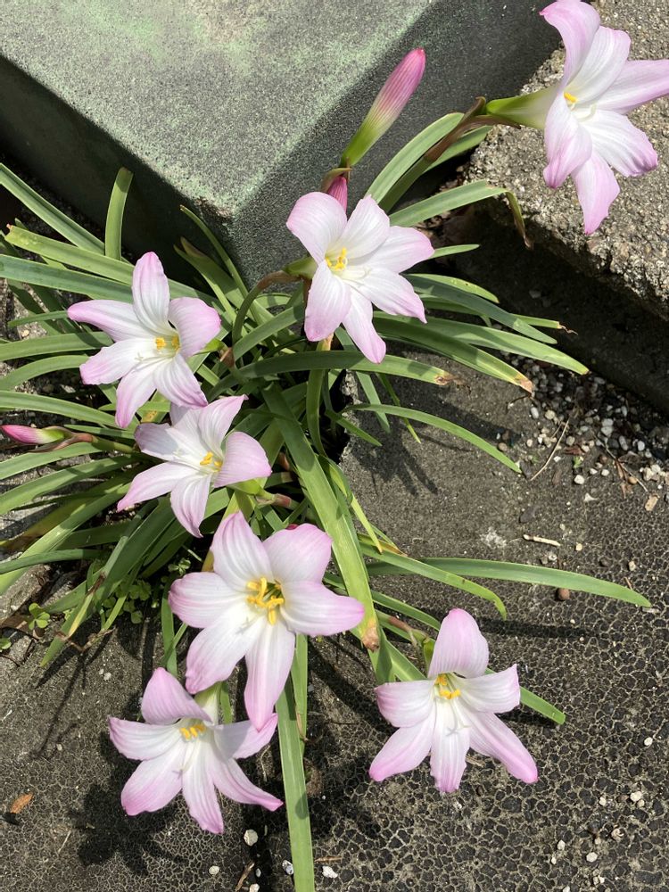 雨上がり一斉に咲いたレインリリー少し花色が薄め