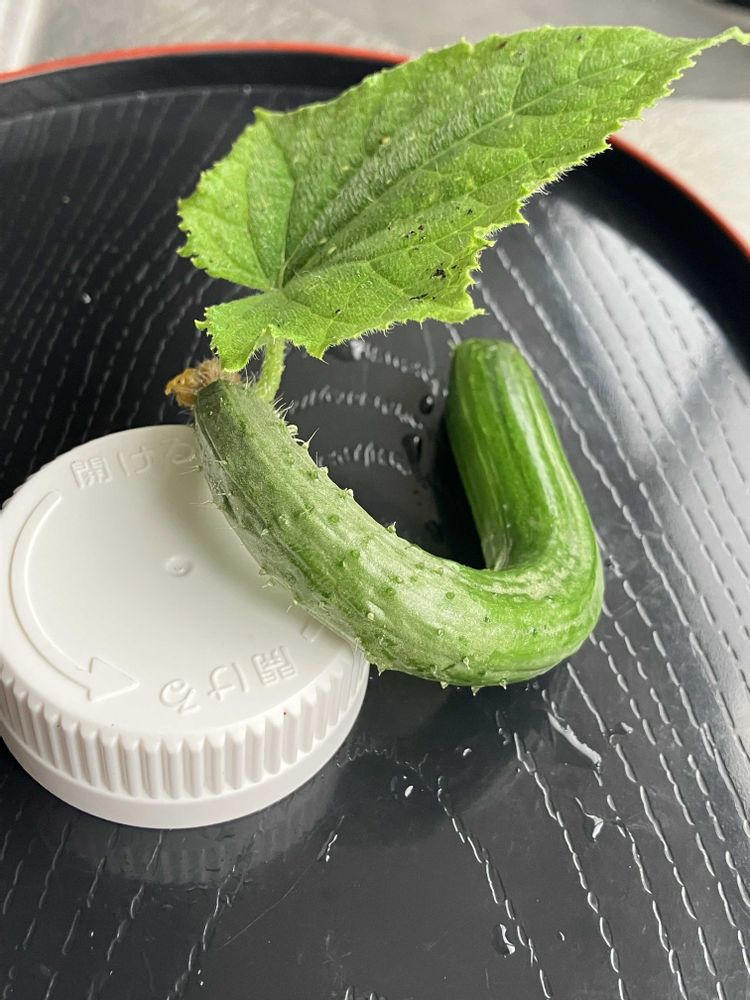我が家の初成りきゅうり 花の先に葉っぱつけてました^_^