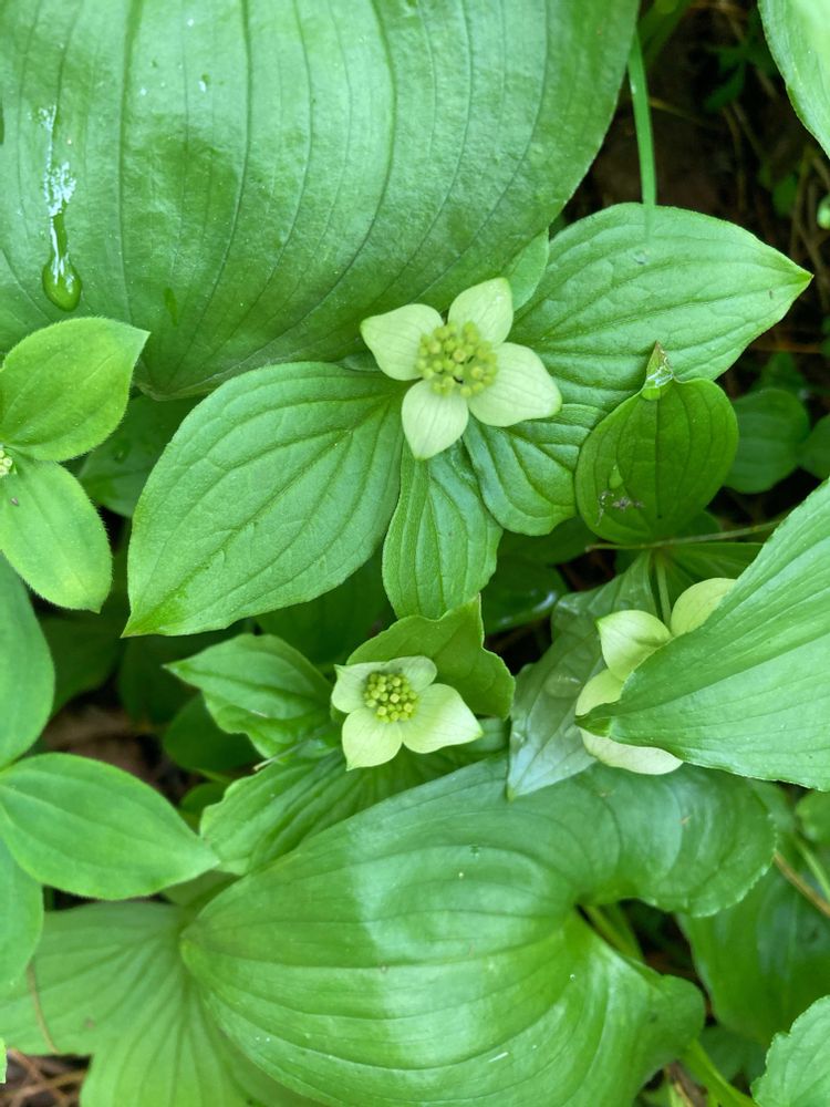 ゴゼンタチバナと同様に葉っぱが4枚では花をつけず、6枚になると花をつけます。花弁に見えるのは総苞で、中央にあるのが花です。